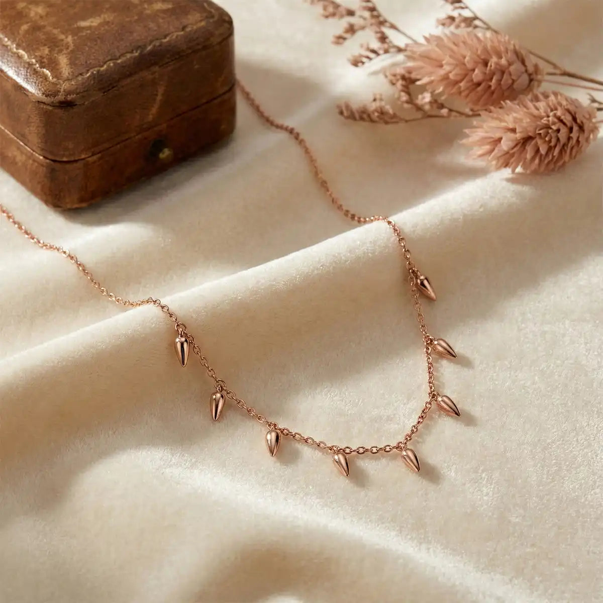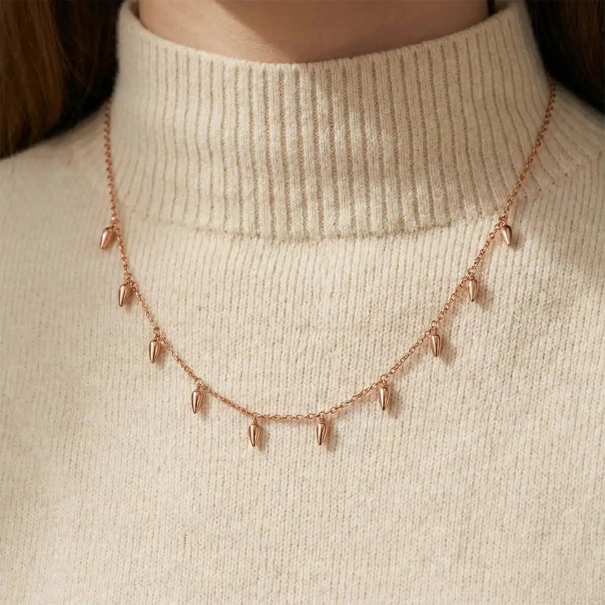 The Rose Gold Spear Charm Necklace is a bold expression of modern elegance. Designed with sleek, tapered spear-shaped charms suspended from a fine rose gold–toned chain, this piece brings together strength and sophistication in a refined silhouette. Its contemporary design makes it perfect for those who love statement jewellery with a minimal yet edgy touch.
