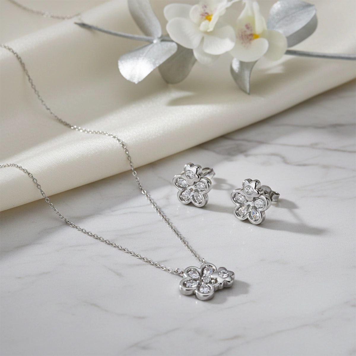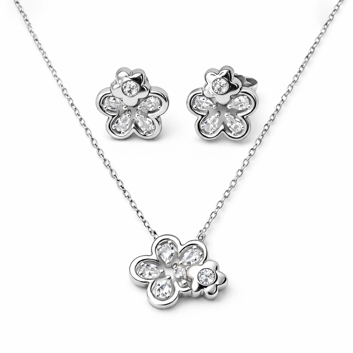 Product Name: Floral Sparkle Silver Pendant & Stud Combo