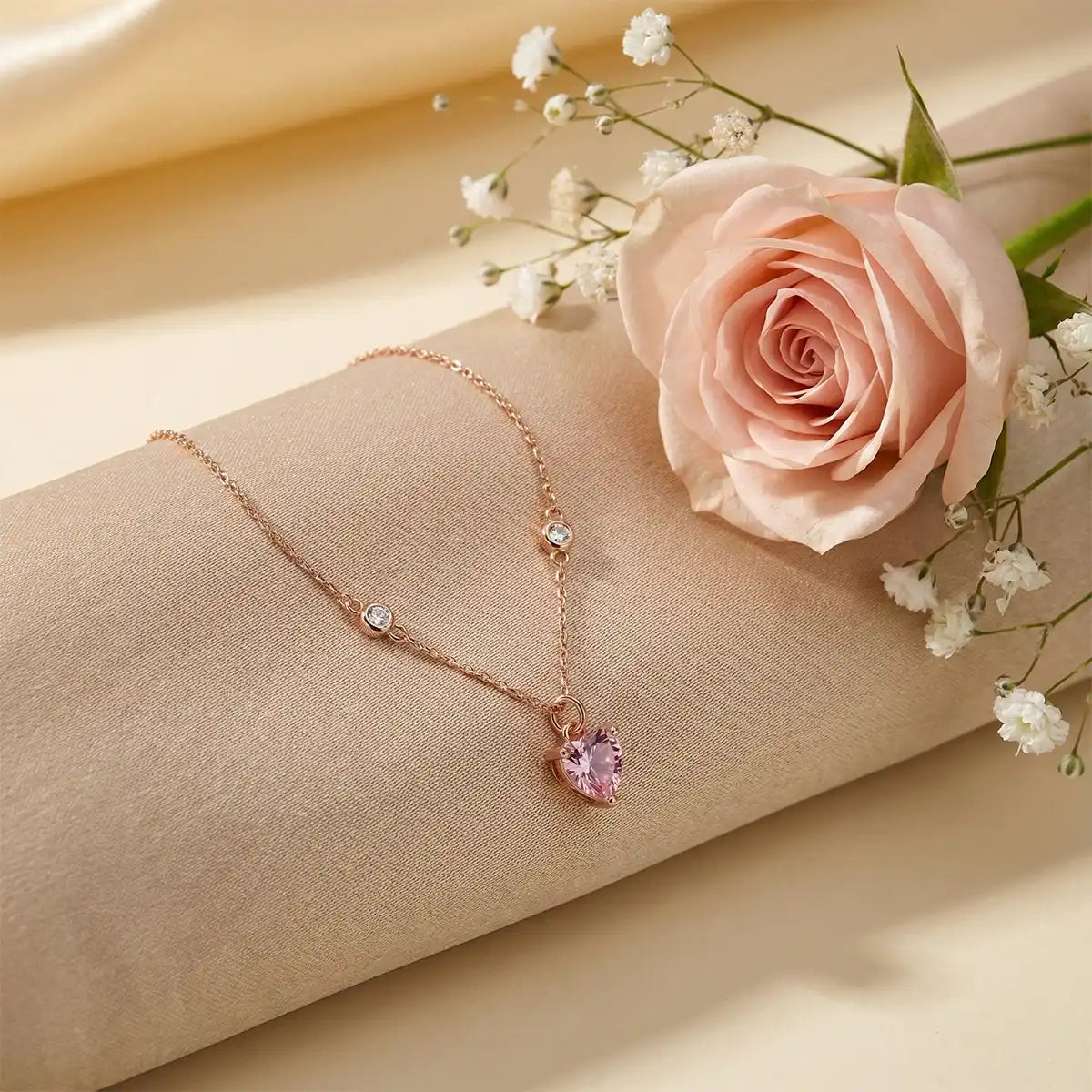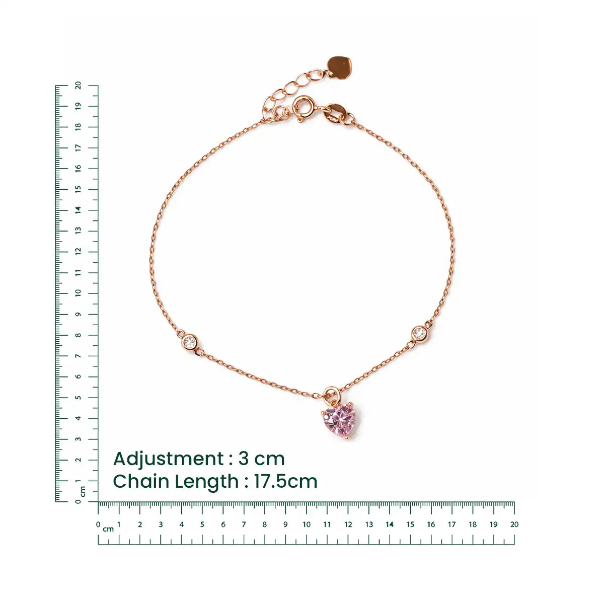 The Rose Gold Pink Heart Charm Bracelet is a soft, romantic piece designed to bring a gentle glow to your everyday style. Crafted with a delicate rose gold–finished sterling silver chain, this bracelet features tiny crystal stations along the chain and a sparkling pink heart charm at the center, creating a beautifully balanced and feminine look.